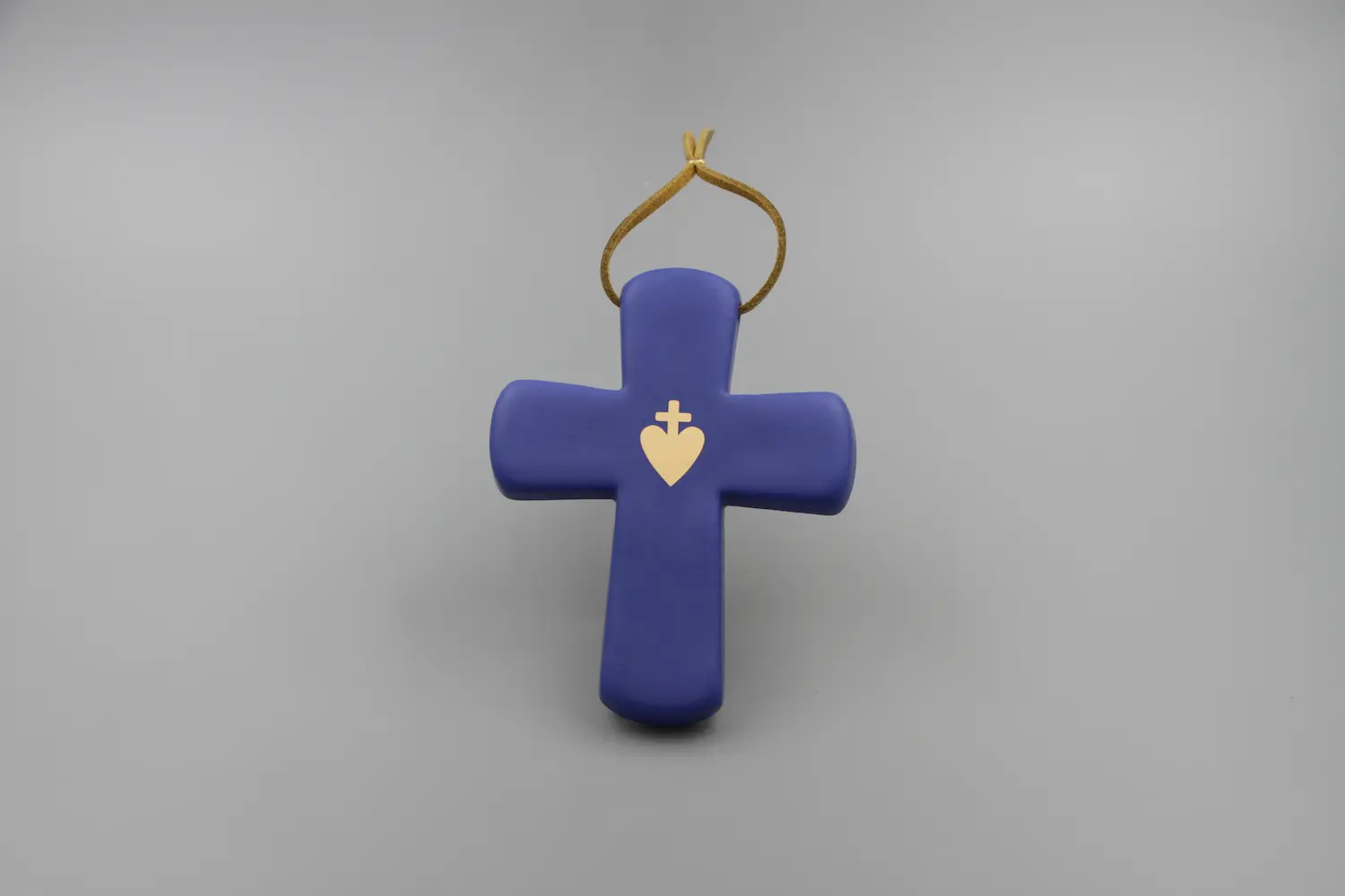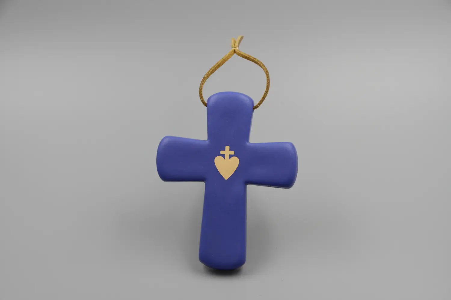 Croix latine au bleu mat profond, sublimée par un Sacré Cœur à l’or véritable.