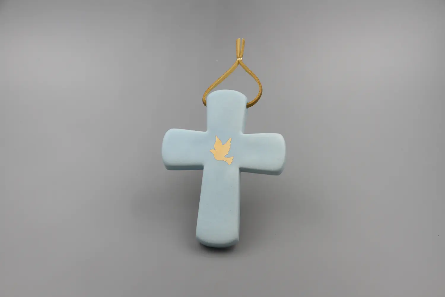 Croix latine au bleu poudré doux, sublimée par une colombe à l’or véritable.